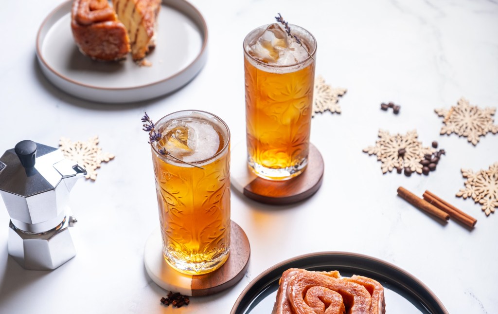 Fancy a dance between two botanical behemoths? Where gin’s bundle of flavors begins and chai’s spices end in Matty McGee’s Cha-Cha is anyone’s guess. Especially when the floor fills in with the hot and trendy two-step of tonic water and cold brew, delivering on the promise of the pair’s irresistibly refreshing bright and dark duality. (The tonic arrives from our friends at Betty Buzz, a maker of yummy mixers founded by Blake Lively.) It ends as all great performances do—with flowers!—as a spritz of lavender bitters provides the perfect fête for such fantastic footwork.